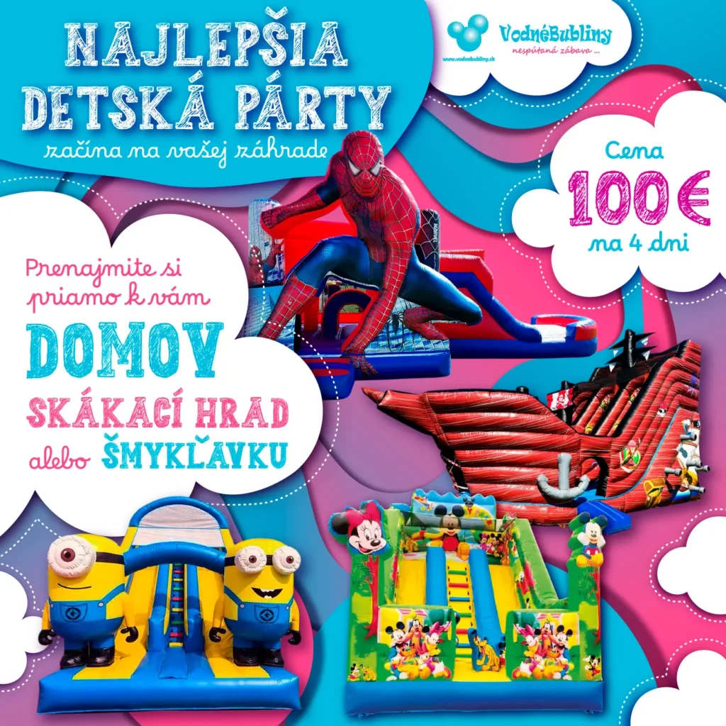Sme VodnéBubliny s.r.o., eventová agentúra s viac ako 15-ročnými skúsenosťami a vlastným portfóliom detských atrakcií. Ponúkame skákacie hrady, šmykľavky, arkádové hry a množstvo ďalších zábavných aktivít. Neustále inovujeme a rozširujeme našu ponuku, aby sme prinášali tie najlepšie zážitky. V letnej sezóne zamestnávame viac ako 100 ľudí, vďaka čomu patríme medzi lídrov v oblasti zábavy na Slovensku.